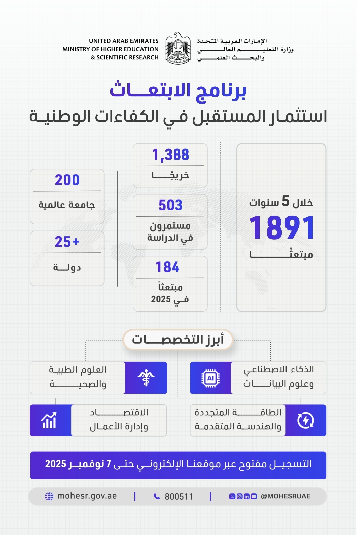 ويأتي التطوير المتواصل لبرنامج الابتعاث ضمن منظومة تحولية أشمل تقودها وزارة التعليم العالي والبحث العلمي بهدف تعزيز تنافسية الدولة وتأكيد دور التعليم كركيزة للاقتصاد المعرفي، بما ينسجم مع مستهدفات رؤية "نحن الإمارات 2031" ومئوية الإمارات 2071، من خلال إعداد جيل قادر على قيادة المستقبل، ومؤهل للتعامل مع المتغيرات العالمية وتسخير التكنولوجيا والابتكار لصالح الوطن.