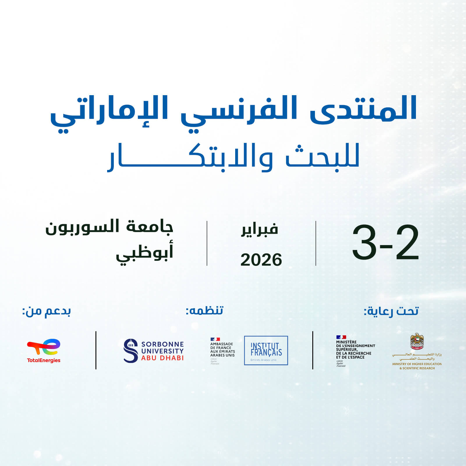 ويُنظَّم المنتدى من قبل سفارة الجمهورية الفرنسية لدى الدولة وجامعة السوربون أبوظبي، بالتعاون مع دائرة التعليم والمعرفة– أبوظبي، ومعهد الابتكار التكنولوجي، ذراع الأبحاث التطبيقية لمجلس أبحاث التكنولوجيا المتطورة، والمعهد الوطني الفرنسي للبحث في العلوم والتقنيات الرقمية، ليشكّل منصة رفيعة تجمع صناع القرار والباحثين والخبراء؛ لاستعراض فرص التعاون العلمي، وتبادل المعرفة، وبناء شراكات استراتيجية في المجالات البحثية الحيوية.