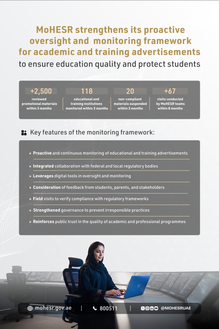 The Ministry of Higher Education and Scientific Research (MoHESR) has monitored more than 2,500 digital advertisements within the country from 118 educational and training institutions between June and early September 2025 through its proactive, tech-enabled monitoring framework. The Ministry’s monitoring efforts fall within its ongoing efforts to ensure the quality of higher, vocational and applied education programmes and to protect students from non-compliant promotional practices.